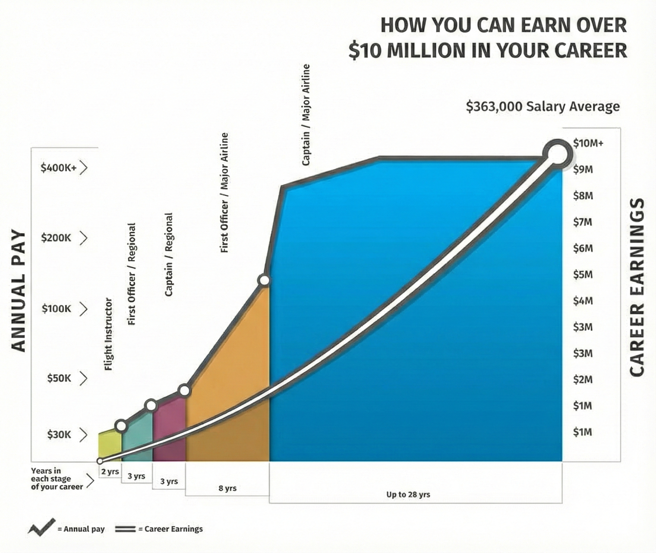 Not only can you earn seven million in your career as a professional pilot for the airlines, but the journey to get there, from your Private Pilot, Instrument Rating, Commercial Pilot, CFI, Multi-Engine, and ATP is rewarding and exciting!